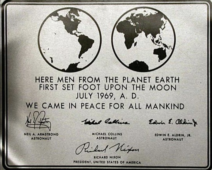 And a few flights later, Apollo 11, landing humans on the moon for the first time in July, 1969, bore a plaque on the lunar landing craft (image above and below, at bottom), stating: